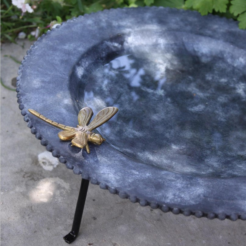 Fågelbad i kompositmaterial med svartmålad järnställning.