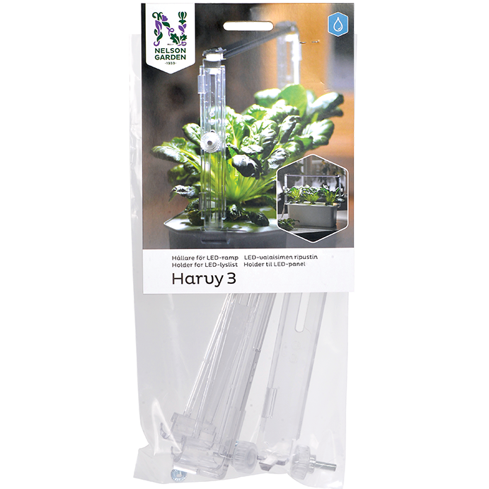 Hållaren fästs på lådan och möjliggör därför valfri placering av Harvyn. Höjdjusteringen går från 18cm till 35cm för att du enkelt ska kunna justera höjden efter hur dina plantor växer i din hydroponiska odling. LED-rampen fäst med clips i hållarens vinklade övre del. Clips ingår.