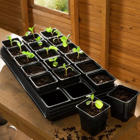 Ett krukset med 18st fyrkantiga krukor med ett bottentråg, vilket gör att alla krukor är samlade på ett ställe och sådden blir enkel att flytta.