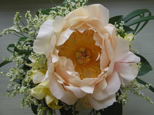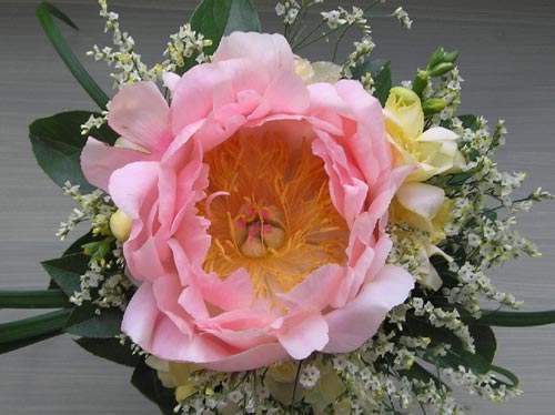Vacker bukett du har! Det är en pion som ändrat färg. Det är inte helt vanligt att de ändrar färg så markant, från rosa till gul, men vissa sorter tycks göra så.