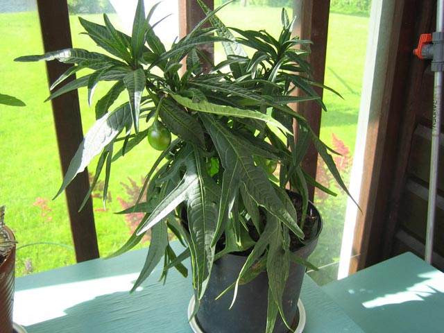 Det var inte det enklaste att hitta växten, men nu så: den heter känguruäpple på svenska, Solanum laciniatum. Tomat- och potatissläkting alltså. Åtminstone bären lär vara giftiga. Den kan odlas som ettårig krukväxt. Samla mågen frö på hösten och du kan också ta ett par sticklingar som du prövar att övervintra. Fröerna ska gro lätt på våren. Det är ingen idé att övervintra moderplantan, den blir ful så småningom.