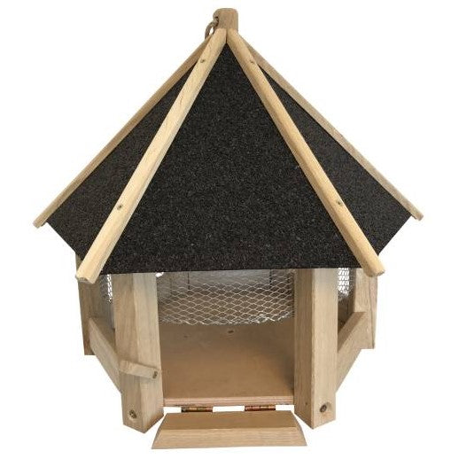 Ett fågelbord för upphängning av FSC-certifierat ek. Fågelborden är utrustade med nät för att säkerställa att skator och duvor inte äter upp maten. Taket är klätt med svart takpapp på vilken eklister är monterade, precis som själva huset är tillverkat av FSC-certifierad och oljad ek.
