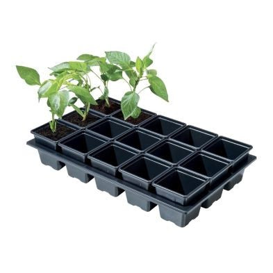 Ett krukset med 15st runda krukor med ett bottentråg, vilket gör att alla krukor är samlade på ett ställe och sådden blir enkel att flytta.