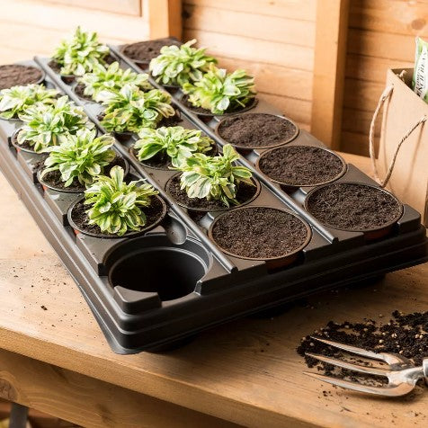 Ett krukset med 18st runda krukor med ett bottentråg, vilket gör att alla krukor är samlade på ett ställe och sådden blir enkel att flytta.