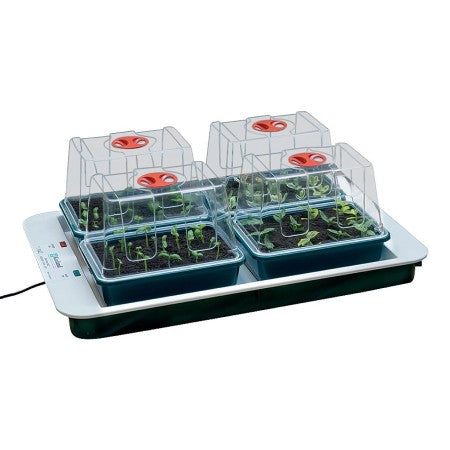 Med plats för sju miniväxthus med undervärme gör storleken det enkelt att ha på fönsterbrädan och enkelt att odla olika plantor. Den uppvärmda basen innehåller ett 40 watts kolfiberelement för jämn värmefördelning. Denna enhet är termostatstyrd och är utformad för ha jordtemperaturen med cirka 19°.