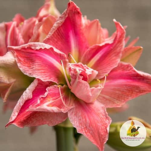 Sorten 'Sweet Nymph' är en underbart söt amaryllis som blommar med helt fyllda blommor i klarrosa med mörkare ådring och ljusare rosa kanter.