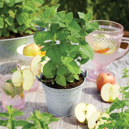 Äppelmyntan har ett kraftigt växtsätt och gröna, rundade, mjuka blad. Doftar ljuvligt av äpple. Blommar sent med små rosalila blommor. Älskas av fjärilar och bin vid blomning. Snabbväxande.