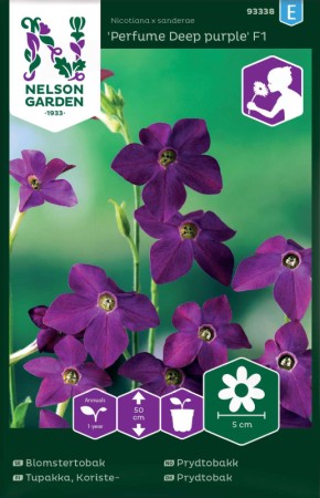 Perfume Deep purple' är en frisk sort med 4 centimeter stora uppvända blommor. Plantan blommar hela sommaren. Blomstertobak pollineras av nattfjärilar, därför doftar de härligt och fyller kvällsluften med sin delikata parfym. Plantera dem nära en plats du brukar vara på under kvällstid för att kunna njuta av den goda blomdoften. Fin till snitt, njut av den goda doften i en blomvas.