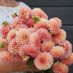 Dekorativ Dahlia 'Natalie G' får fina aprikos till orangegula blommor. Blommorna blir ca 9cm i diameter. Underbar med flera i grupp i rabatten. Fin som snittblomma.