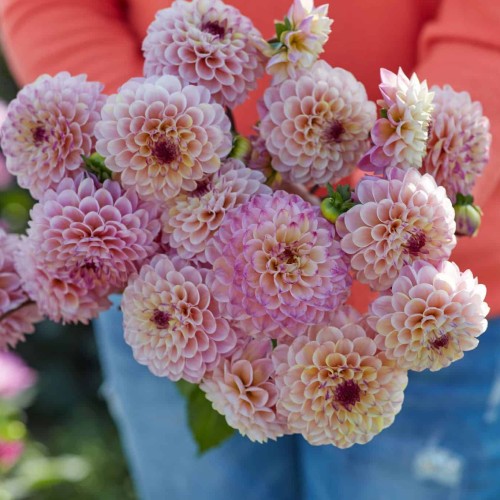 Dahlia 'Wine Eyed Jill' är en boll dahlia med små till medelstora blommor. Färgen kan även skifta från blomma till blomma med en nyans av rosa, koppar och gul. Blommorna blir ca 10cm i diameter. Underbar i kruka och med flera i grupp i rabatten. Fin som snittblomma.