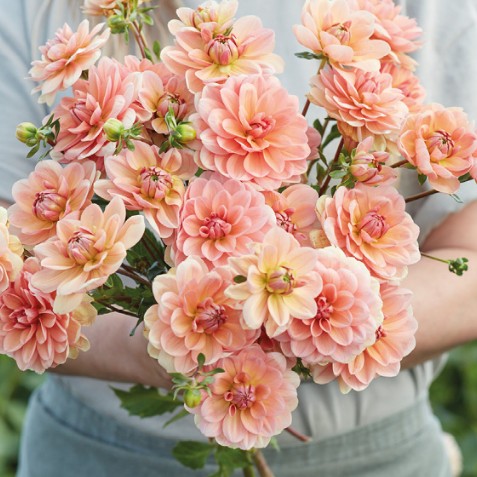 Dekorativ Dahlia 'Yelno Harmony' får aprikos till orange-gula blommor som får en underbar kontrast på varje blomma. Blommorna blir ca 11cm i diameter. Underbar med flera i grupp i rabatten. Fin som snittblomma.