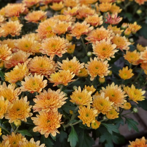 Klassisk bollkryss med blommor i orange nyanser. Tät och rundad form och små mörkgröna blad som doftar gott vid beröring.