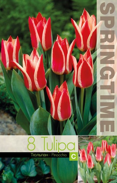 Botanisk Tulpan 'Pinocchio' är en vacker röd tulpan med vita kanter på kronbladen. Botaniska tulpaner kallas också vildtulpan. Botaniska tulpaner blommar tidigt på säsongen och blir i regel inte så stora - men väldigt vackra! Uppskattas av bin och andra pollinatörer.
