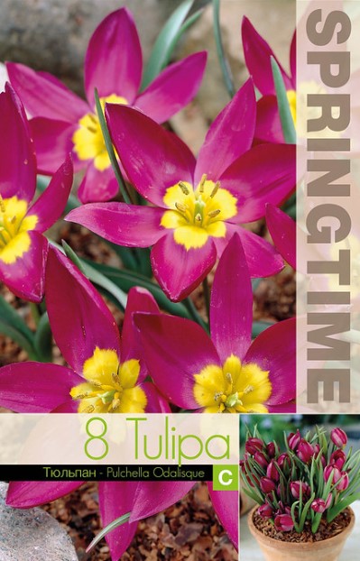 Botanisk Tulpan 'Pulchella Odalisque' har en fin mörklila färg på krinbladen och en gul mitt. Botaniska tulpaner kallas också vildtulpan. Botaniska tulpaner blommar tidigt på säsongen och blir i regel inte så stora - men väldigt vackra! Uppskattas av bin och andra pollinatörer.