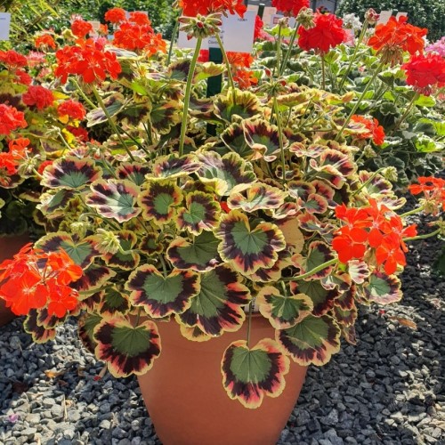 Denna Zonalpelargon 'Special Contrast' har en underbar färgvariation på bladverket. Lika fin även utan blommor. Blommorna har en orange-röd färg och ger verkligen den speciella kontrasten som namnet antyder.