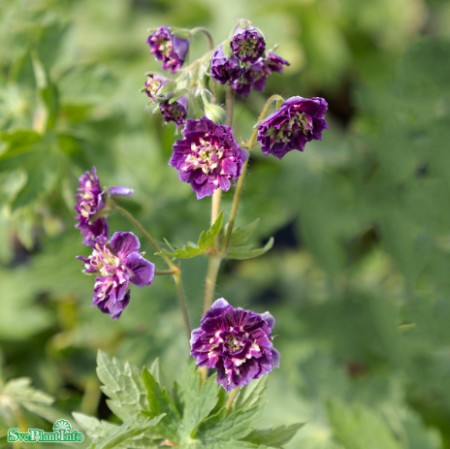 Tuvbildande sirlig perenn. Fyllda mörkvioletta blommor med limegrön mitt i juni-juli. Frodigt gröna, flikiga blad. Sol-skugga. Tämligen anspråkslös.