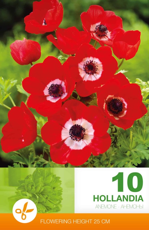 Bukettanemon 'Hollandia' är en spektakulär röd anemon med vitt centrum och svart öga. Vacker lyskraft! Blommar sent i juni-augusti och passar bra som snittblomma.