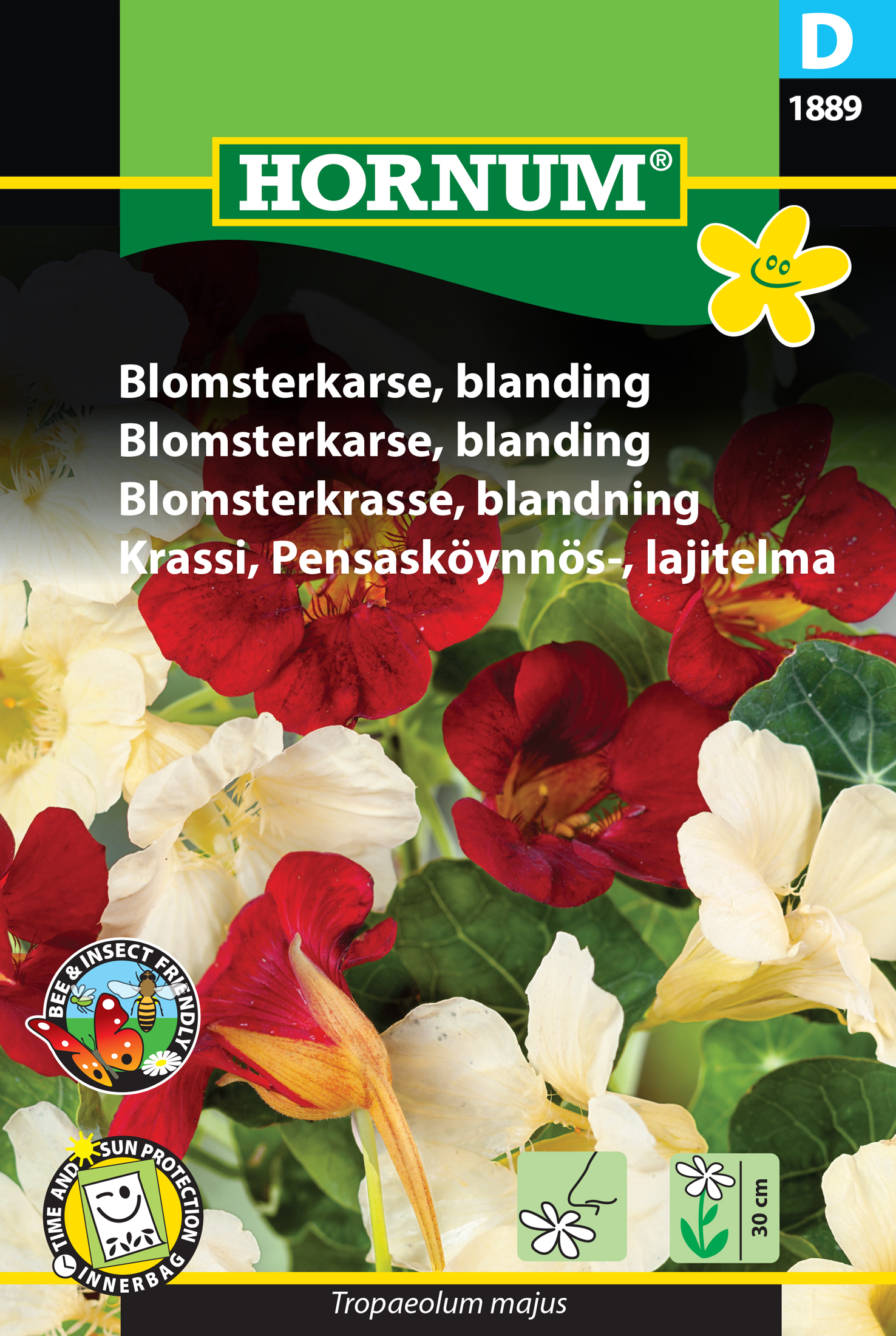 Blomsterkrasse kallas även indiankrasse. Det finns två sorters Blomsterkrasse: Buskkrasse och Slingerkrasse. Denna sort är en Buskkrasse som är känd för sina vackra, slingrande rankor och färgglada blommor. Växten har smala, gröna blad som växer längs långa, förgrenande stjälkar. Rankornas längd kan variera och buskkrassens rankor blir inte så långa som slingerkrassens. Blommorna på Buskkrassen är den mest påfallande delen av växten. Blommorna sitter i kluster längs med rankorna och bildar en vacker och färgstark syn.