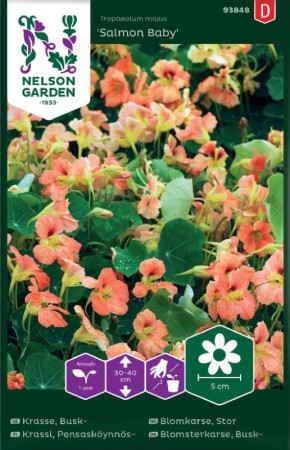 Buskkrasse/ Indiankrasse 'Salmon Baby' är en användbar och lättplacerad trädgårdsväxt för såväl köksträdgården som lådor och krukor. De frodiga plantorna översållas av dubbla, starkt laxrosa, blommor som är ätbara och mycket dekorativa i sommarens sallader. Omogna frön från buskkrasse kan också läggas in och ätas som kapris.