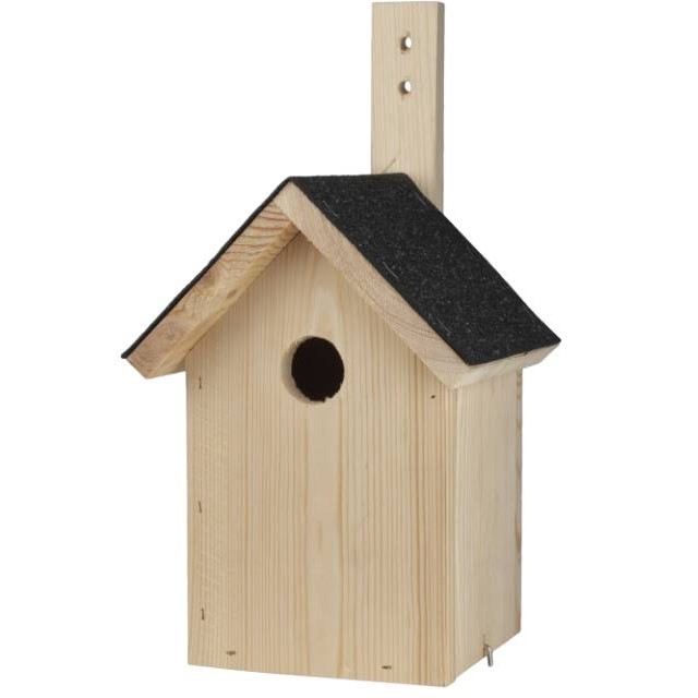 En enkel fågelholk i FSC-certifierad furu. Taket är belagt med takpapp.
