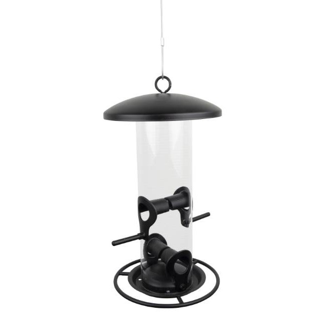 En liten fågelmatare i svart metall som passar bra för olika slags frön. Foderkammaren är gjord i plexiglas.