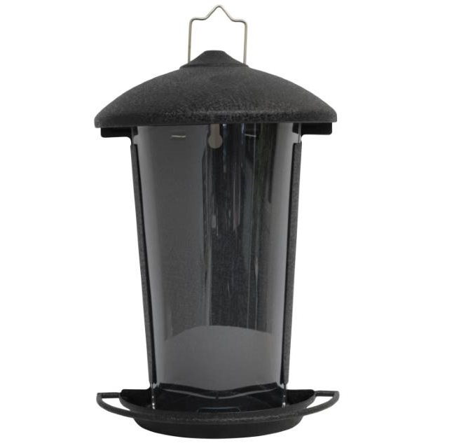 Foderautomat till frön och solroskärnor. Den har uppsamlingsskål och plats för flera fåglar samtidigt.