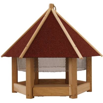 Ett fågelbord för upphängning av FSC-certifierat ek. Fågelborden är utrustade med nät för att säkerställa att skator och duvor inte äter upp maten. Taket är gjort av röd takpapp.