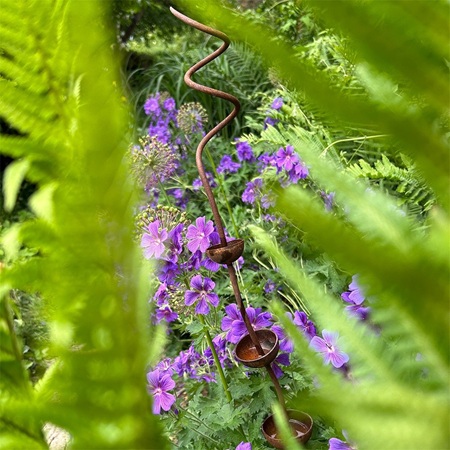 Pinnen i järn har tre kupor som fungerar som vattenhål för trädgårdens insekter och fåglar. Toppen är snurrad på ett dekorativt vis.