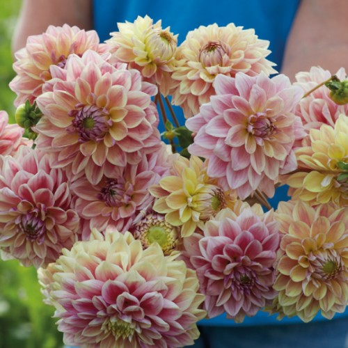 Dekorativ Dahlia 'Dusty Beauty' får läckra blommor i olika nyanser av rosa och gyllene gul. Blommorna blir ca 12cm i diameter. Underbar med flera i grupp i rabatten. Fin som snittblomma.
