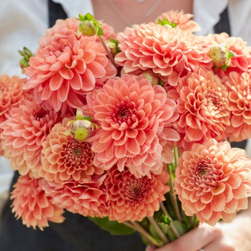Dekorativ Dahlia 'Freeman' får aprikos till orange-gula blommor som får en underbar kontrast på varje blomma. Blommorna blir ca 14cm i diameter. Underbar med flera i grupp i rabatten. Fin som snittblomma.