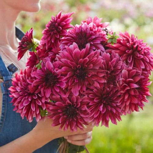 Dekorativ Dahlia 'Tanita' får mörkröda till purpurförgade blommor med en mörkare mitt. Blommorna blir ca 12cm i diameter. Underbar med flera i grupp i rabatten. Fin som snittblomma.
