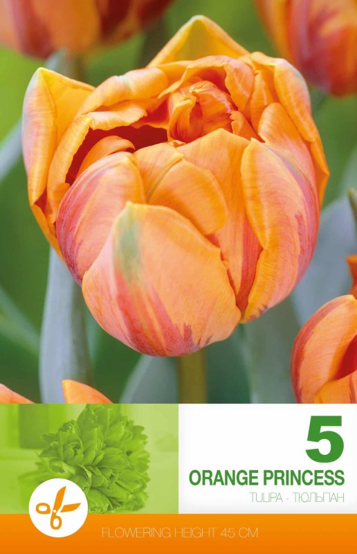 Tulpan 'Orange Princess' är en pionlik tulpan med fyllda blommor i en orange färg och har mörkvioletta strimmor på kronbladen. Blommar sent på säsongen. Blir väldigt fin som snittblomma. Doftar.