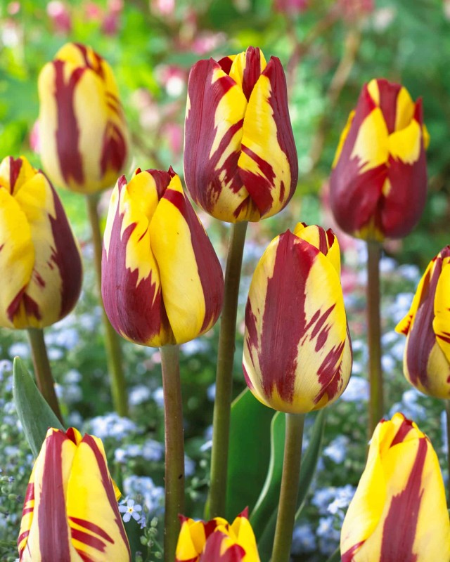 Tulpan 'Helmar' har en otrolig färgkombination som man inte får missa! En rolig kombo av klargul bas med vinröda strimor, gör att den inte blir osynlig i rabatten eller krukan.