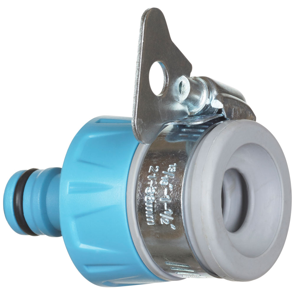 Koppling för anslutning av vattenslang till inomhuskranen. Universalstorlek upp till 17 mm. Spännes fast över kranens öppning. Passar på de flesta moderna vattenkranar.