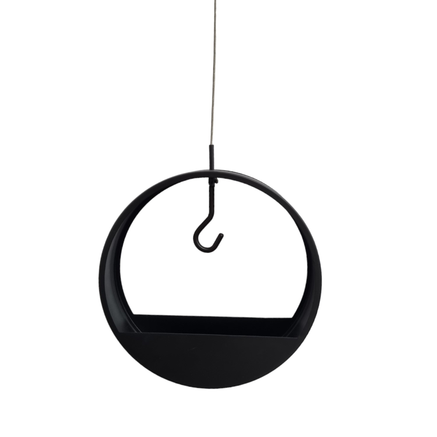 Gjord i svart metall. Upphängningslina ingår.