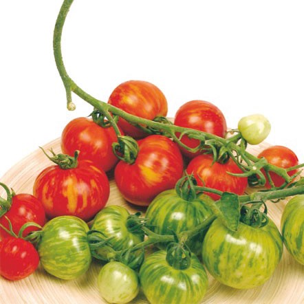 Frilandstomat 'Tigerella' är en tilltalande sort med gyllene "tigerränder"/strimmor på röd botten. Medelstor frukt med söt smak, tidig skörd. Vacker i sallader och som dekorering på smörgåstårta eller andra maträtter.