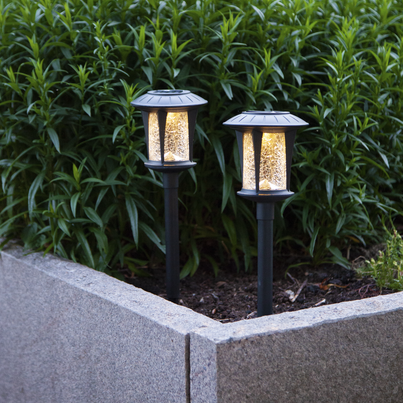 2p solcell gångljus som lyser upp med varmvitt sken genom det krackelerade glaset. Solcellspollarna är en fin dekoration till trädgården eller balkongen.