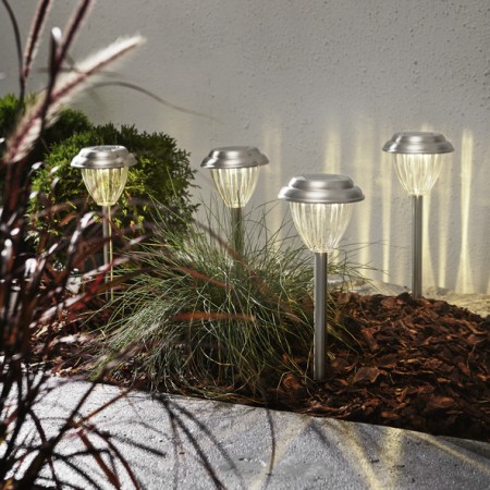 4-pack gångljus av stål. Fin dekoration att placera i entrén, på stigen och i trädgården. Solcellspollaren ger ifrån sig ett mysigt och inbjudande ljus.