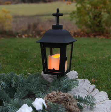 Artikelnummer: EE068-89Vacker gravlykta i svart metall. Lyktan är 24cm hög, och markpinnen är 27cm hög. Med lyktan kommer också två olika toppdekorationer. Ljuset drivs med 3 stycken AAA batterier och har en sensorfunktion.