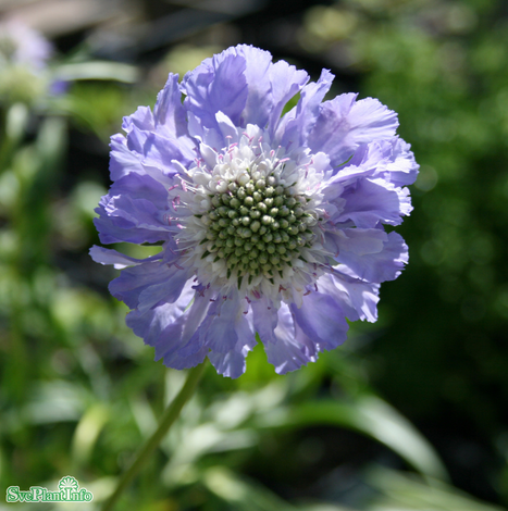 Tuvbildande perenn med sirligt växtsätt. Ljusblå-violetta, korglika blommor och flikigt grågrönt bladverk. Blommar länge. Gillas av fjärilar, bin och andra pollinatörer. Självsår sig lätt. Blir jättefin som snittblomma.