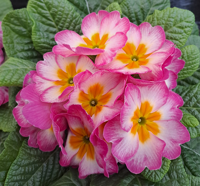 Jordviva 'Bicolor Pink' har vackert flerfärgade blommor i rosa och vitt med gult öga. Blommorna sitter på korta stjälkar i mitten av plantan, omgivna av en bladrosett med avlånga, krusiga blad.