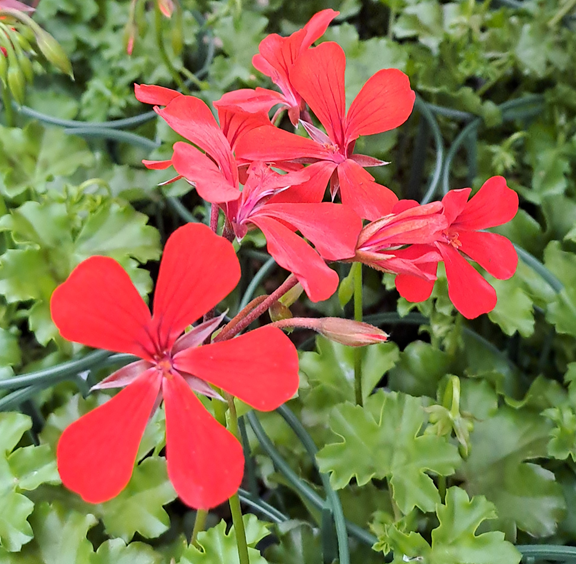 Kaskadpelargon 'Bright Red' får ett hav av enkla röda blommor. Den har ett kraftigt växtsätt och tidig blomning, blommar villigt hela sommaren, från maj och framåt.