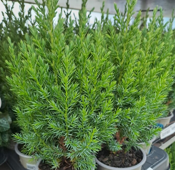 Städsegrön, pelarformad och upprättväxande buske med vackra gröna barr som skimrar i silver. Sorten är tät och långsamväxande.