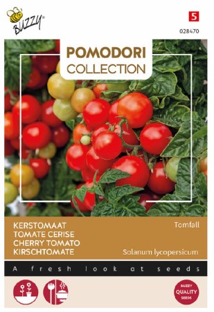 Tomfall är en körsbärstomat som passar utmärkt i ampel. Får många små röda tomater. Behöver ej tjuvas.