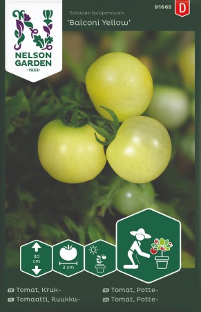 Körsbärstomat 'Balconi Yellow' är en 30 centimeter hög körsbärstomat. Plantan är mycket kompakt med mörkt gröna blad. Frukterna är ljust gula, avlånga i formen och avslutas med en liten spets. Frukten utvecklas snabbt och tomaterna är härligt smakrika med frisk och söt arom. Kruktomat 'Balconi Yellow' är framtagen för odling i kruka inomhus, på balkong eller på altan. Den kan även odlas i Harvy. En tomat att njuta av hela året!