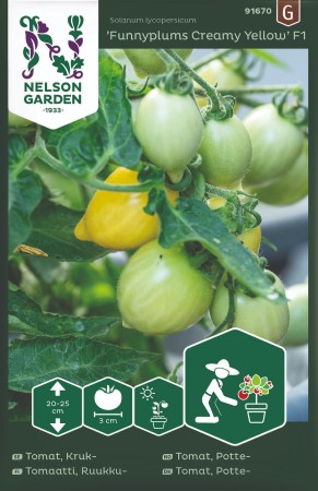 Körsbärstomat 'Funnyplums Creamy Yellow' är en spännande sort då plantan blir så liten och söt. Frukterna är gräddgula och plommonformade. Plantans blomma reser sig dekorativt ovan bladverket som ett litet paraply. Den ger en tidig, rik skörd av fruktklasar som ligger utanpå plantans bladverk. 'Funnyplums Creamy Yellow' passar odlaren som vill ha en lättskött tomatsort som är dekorativ och ger mycket tomater i förhållandet till utrymmet.