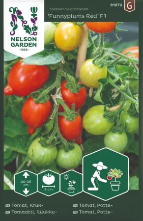 Körsbärstomat 'Funnyplums Red' F1 är en dekorativ liten kruktomat som kan odlas i 12--16 centimeter stor kruka. En annorlunda sort då tomaterna har en avlång plommonform som avsmalnar till en spets. Trots att den är liten ger den en rik skörd av lättplockade frukter. Tomaterna smakar fylligt med en fin sötma. Plantans blommor är läckra då de reser sig ovan bladverket som små paraplyer När tomaterna mognat ligger de som ett rött täcke utanpå bladverket.