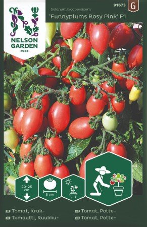 Körsbärstomat 'Funnyplums Rosy Pink' F1 får blossande rosa, avlånga tomater som smalnar av till en spets längst ut. Plantan har ett kompakt växtsätt och bildar rikligt med goda tomater. 'Funnyplums Rosy Pink' F1 är väldigt söt under blomningen eftersom blomställningarna reser sig i kaskader ovanför bladverket. När de sedan bildar frukt brer de plommonformade körsbärstomaterna ut sig som ett blossande rosa täcke över bladen.