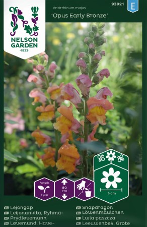 Toppa gärna plantorna som små. Kan behöva stöd. Trivs i lucker välgödslad jord, vattna vid torka. Lejongap 'Opus Early Bronze' är en vacker och storvuxen sommarblomma för odling i både kruka, rabatt och bland grönsakerna i köksträdgården. Lejongap är ett måste för den som gillar att plocka buketter från trädgården tack vare sina sprudlande färger och eftersom de fasta stjälkarna är hållbara och står länge i vas.