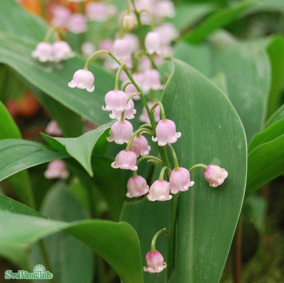 Förtjusande rosablommande variant av den vanliga vildväxande liljekonvaljen. Har liksom den underbara klockformade och karakteristiskt starkt doftande blommor. Friskt mörkgrönt bladverk. Lågväxande perenn som sprider sig med underjordiska stammar. Får röda bär som inte får ätas. OBS! Mycket giftig.